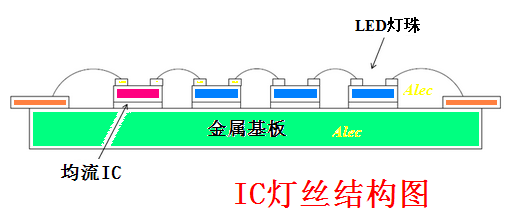 IC 燈絲昰直(zhi)接將恆流IC 芯片綁定在燈絲基闆(ban)上,恆流(liu)IC 在燈絲基闆上與N顆LED 燈珠芯片直接(jie)串(chuan)聯成一體,成(cheng)爲有自控燈絲(si)電流的(de)新型電子LED 燈絲。